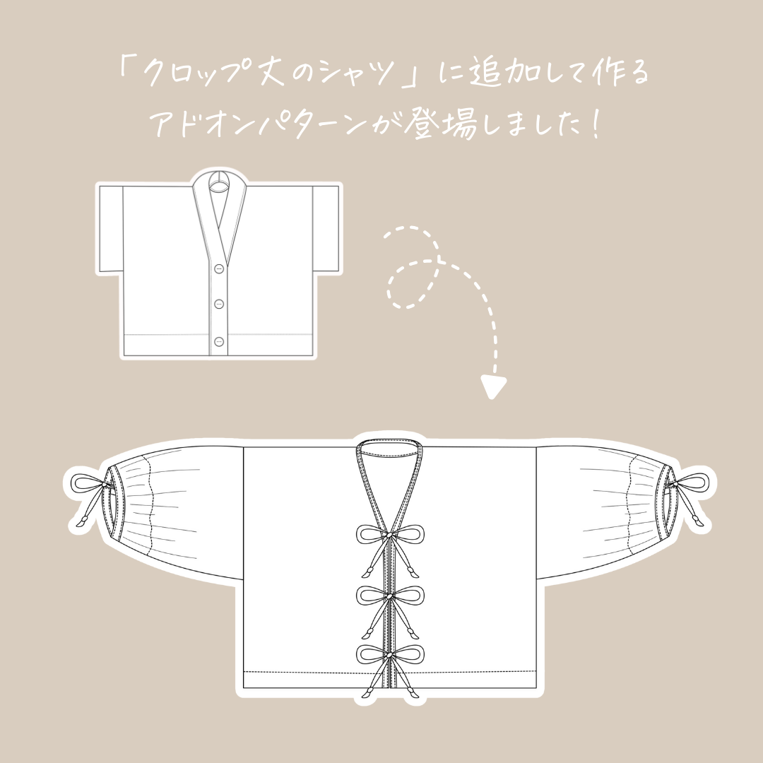 アドオンパターンとは、親パターン「クロップ丈のシャツ」をベースにして作る追加レシピです。 このリボンブラウスを縫うためには、親パターンの仕様書とテンプレートが必要です。
