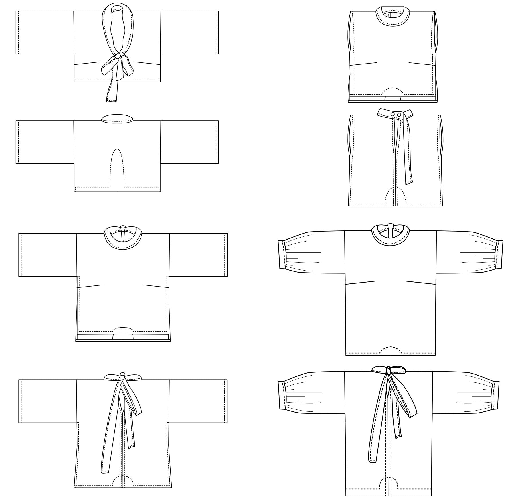 スタイル1の白いボウタイの写真は、ツイルのような厚手のオーガニックコットンです。スタイル1と3は、張りのある生地で作ると服のシルエットがしっかり出てかわいいと思います。スタイル2と4は、柔らかな生地でオーバーサイズに作るとパターンの良さがでそうです。シースルーの生地で作ってもかわいいと思います。